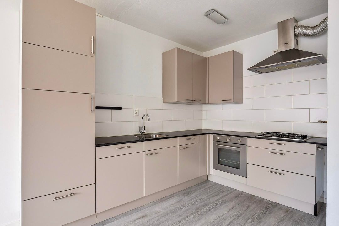 De moderne open keuken is volledig uitgerust met inbouwapparatuur, waaronder een gaskookplaat, afzuigkap, oven, koelkast met vriezer en vaatwasser. Alles wat je nodig hebt om comfortabel te koken en leven.