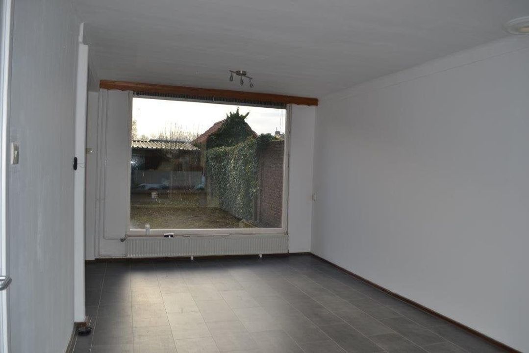 Woonkamer van ca.25 m2 met donkergekleurde tegelvloer. Er is genoeg ruimte voor het creëren van een apart zit- en eetgedeelte.