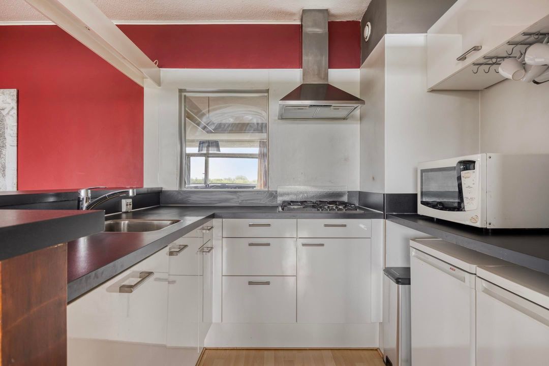 De ruime woonkamer van ca. 37 m² heeft een open keuken die is uitgerust met een vaatwasser, koelkast, vriezer, magnetron, afzuigkap en gaskookplaat. De woonkamer geeft toegang tot een groot, zonnig balkon aan de voorzijde.