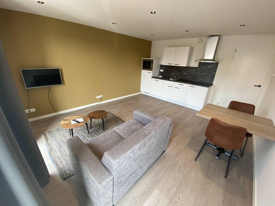 Doorgang naar de ruime woonkamer, voorzien van mooie pvc vloer, verduisterende gordijnen en verlichting. Het appartement beschikt over een open keuken in wandopstelling voorzien van inductie kookplaat, afzuigkap, vaatwasser, koelkast, combi magnetron, wastafel en diverse onder en boven kastjes.