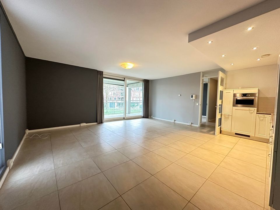 Ruime woonkamer van ca. 35 m² met open keuken voorzien van de volgende inbouwapparatuur: combi oven-magnetron, koelkast met vriesvak, elektrische kookplaat en vaatwasser.